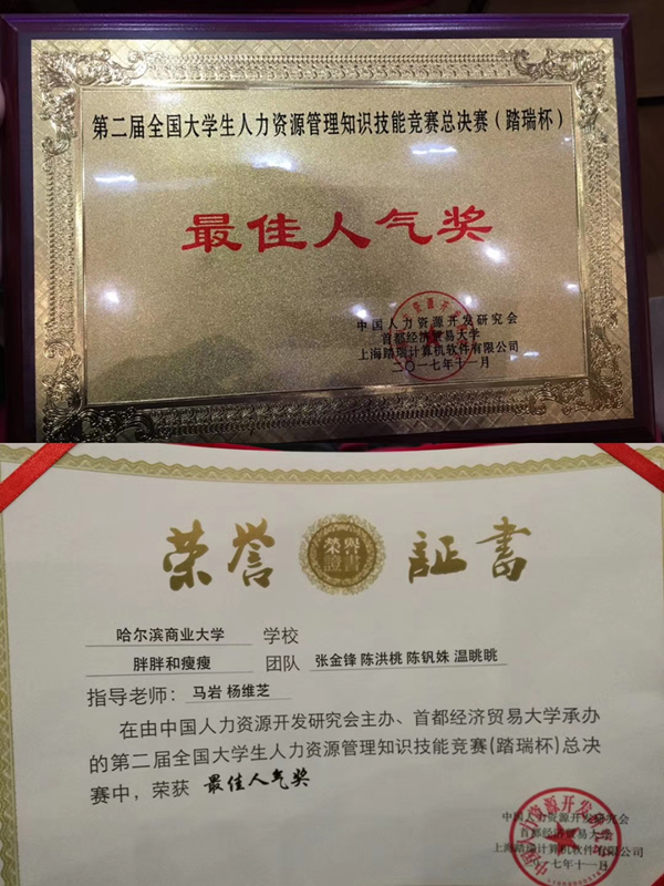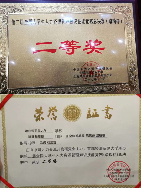 2017年11月4日,第二届全国大学生人力资源管理知识技能竞赛总决赛(踏瑞杯)在首都经济贸易大学拉开帷幕,本次竞赛由中国人力资源开发研究会主办,首都经济贸易大学劳动经济学院承办,我校财政与公共管理学院王巍教授担任本次大赛裁判。比赛主要考察大学生在人力资源管理专业方面的应用效果和方案设计。由我校管理学院马岩、杨维芝、徐磊等老师指导,由管理学院15级人力资源管理专业的张金锋、温眺眺、陈洪桃、陈钒姝等四位同学组成了“胖胖和瘦瘦”哈商大代表队,历时8个多月的精心准备和大量训练,他们从全国73支队伍、近500余名选手中脱颖而出,荣获总决赛二等奖和最佳人气奖。
